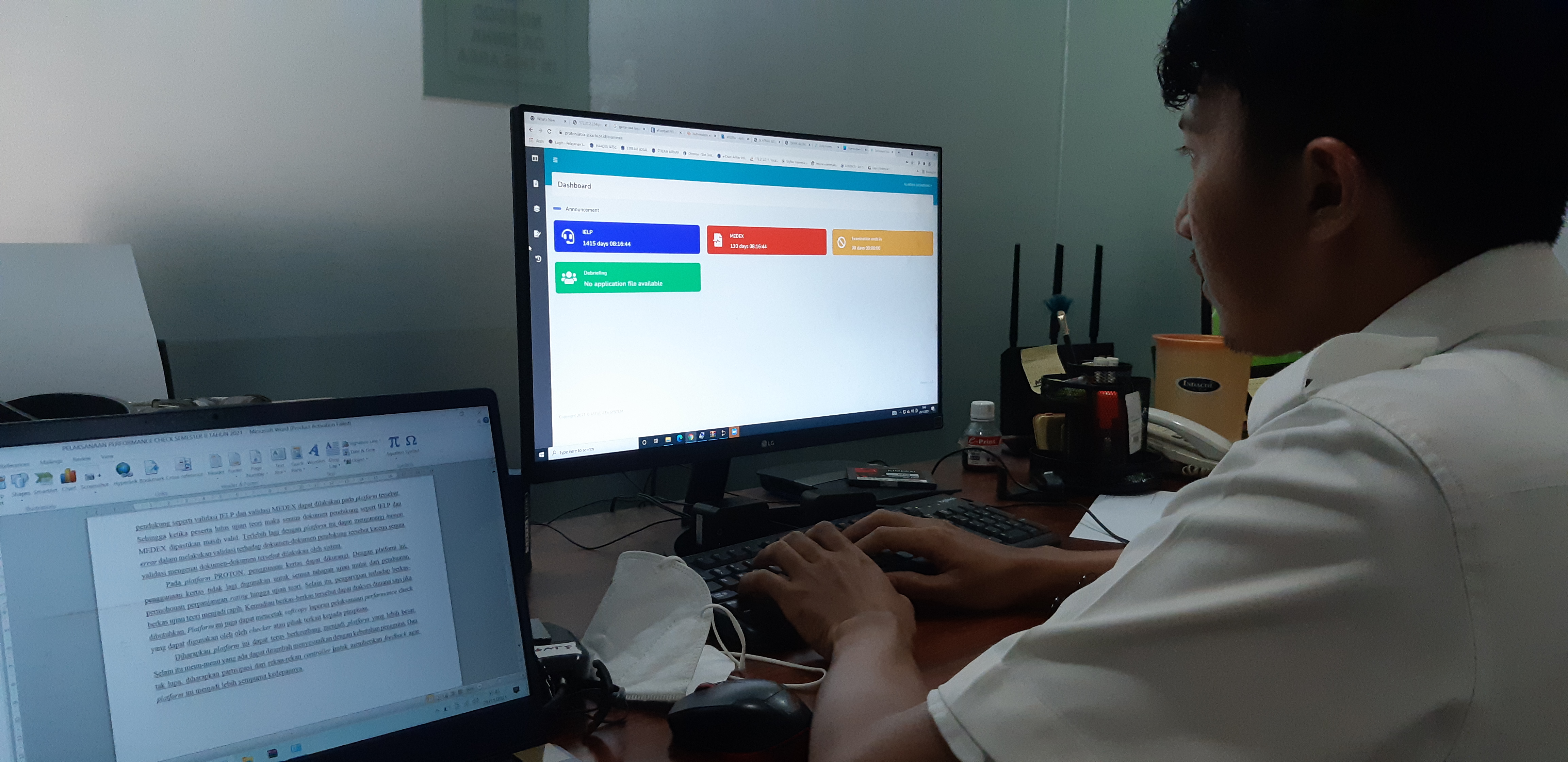 Personel pemandu lalu lintas penerbangan melakukan Performance check untuk ujian teori secara online. Dengan melakukan ujian teori secara online, maka ujian teori bisa dilakukan dimana saja. Mengingat sekarang Indonesia masih dilanda pandemik Covid-19 yang belum bisa diprediksi kapan berakhirnya, ujian teori online sangatlah membantu. Dengan ujian teori online, social distancing bisa tetap terjaga guna mengurangi penyebaran virus Covid-19.